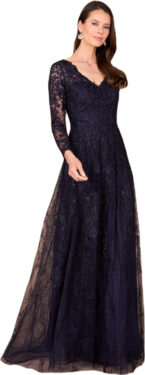 This long sleeve gown features a v-neckline and geometric beading patterns. The stretchy material makes fitting easy for any size. Wear this to your daughter's wedding, and stand out from the crowd.