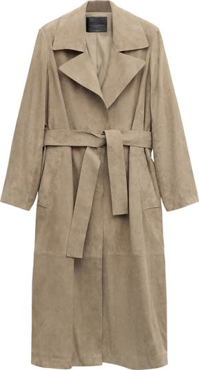 Instantly polish everyday ensembles with this sleek suede trench featuring a longline silhouette and detachable belt.