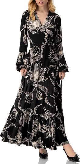 - Elegant long dress in black with a delicate white floral print. Designed with a flattering V-neckline, robe closure, long sleeves with flared cuffs, and a tiered skirt that flows gracefully with each step