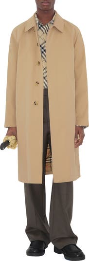 The original Burberry car coat, made in England from shower-resistant cotton gabardine. Inside is Burberry Check cotton, used to line our coats since the 1920s. Part of the Heritage Collection, the Camden is cut to a regular fit with raglan sleeves.||Single-breasted button closure|Side button welt pockets|Button-tab cuffs| Back button vent| Burberry Check lining and undercollar |Comes with a garment bag