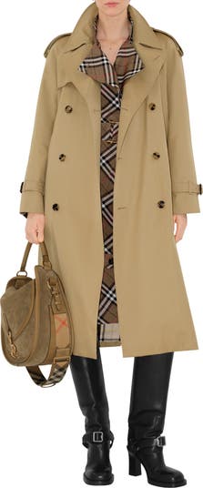 A trench coat made in England from water-resistant cotton gabardine. Inside is Burberry Check, used to line our coats since the 1920s. The Castleford is tailored to a regular fit with raglan sleeves. ||Double-breasted button closure|Throat latch |Epaulettes |B buckle belt|Side welt pockets |Belted cuffs |Back vent|Burberry Check lining and undercollar|Comes with a garment bag