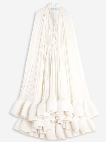 • Flared midi dress with cape-like back and iconic ruffles at the bottom.
