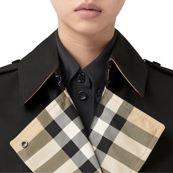 A trench coat in shower-resistant gabardine, woven at the Burberry mill. Inside and at the lapels is Burberry Check cotton, used to line our coats since the 1920s. The design is cut to a regular fit with set-in sleeves.||Double-breasted press-stud closure|Hook-and-eye collar closure|Epaulettes|Belt|Side press-stud flap pockets|Belted cuffs|Back press-stud vent|Burberry Check lining and undercollar