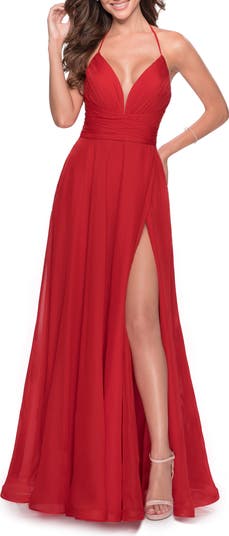 Chiffon prom gown with deep sweetheart neckline and pleated bodice. The back features a unique high clasp that turns into a lace up back. Back zipper closure.
