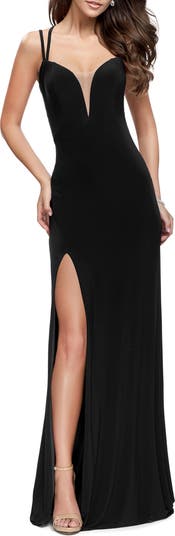 Classic evening gown with a deep V sweetheart neckline. Features a sexy side leg slit and a criss-cross open back. Back zipper closure.