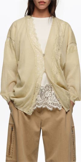 Long straight-cut cardigan in a cotton and linen blend. Features a button-up front, a plunging V-neck with tonal lace, and long shaped sleeves.