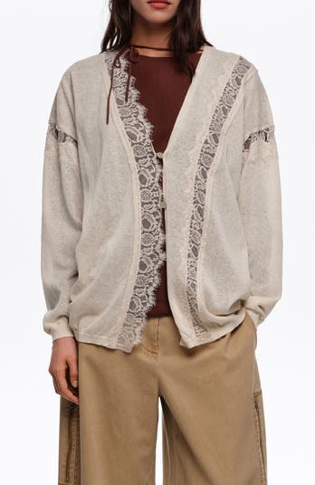 Long straight-cut cardigan in a cotton and linen blend. Features a button-up front, a plunging V-neck with tonal lace, and long shaped sleeves.