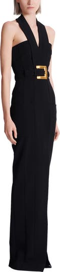 Long crepe halterneck dress Deep V-shaped halter neckline Waist belt with Anthem buckle Side patch pockets and invisible side zip Fitted cut Front vent Model measures 180cm and wears a size 36 Main material: 100% viscose Made in France Item: GF1RP905VB00 100% of the viscose fibres used to make this garment come from certified, sustainably managed forests