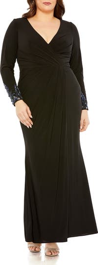 Long Crystal Detail Sleeve V Neck Gown
