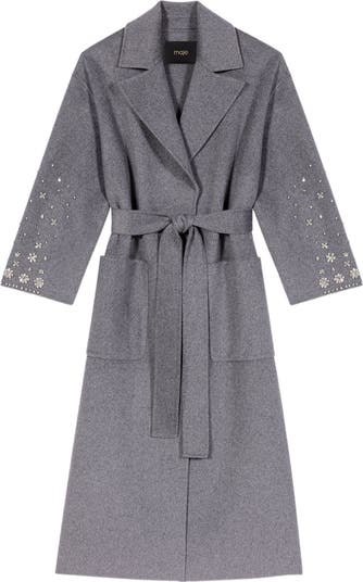 The wardrobe exudes metropolitan elegance, combining enveloping softness with dazzling details. This long coat, made from grey double-faced wool, has a loose, robe-style cut, structured by a generous lapel collar and a tie belt. The cuffs sparkle with rhinestone and bead embroidery in a floral pattern, while the large pockets and side slits highlight its modern feel.For a confident look, slip the beaded white shirt on underneath, and complete the outfit with loafers and a brown suede bag to accentuate the contrasting textures.