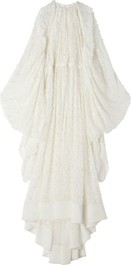 This dress is crafted from silk georgette plumetis fabric, which accentuates the lightness and softness of its design It creates an elegant, feminine silhouette, making it the ideal choice for evening wear.