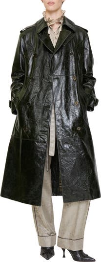 Reworking signature Burberry rainwear, a trench coat made in Italy from embossed calf leather. The Baroque-style pattern is inspired by the exquisite, faded interiors of British stately homes. Debuted on the Burberry Winter 2025 runway, the style is cut to a regular fit with wide raglan sleeves and lined with a tonal Burberry Check. An archival coat inspires the curlicue shape of the pockets and the undercollar is subtly stitched with our signature check.||Double-breasted button closure|Hook collar closure|Throat latch|Epaulettes |B buckle belt|Side button welt pockets |Belted cuffs |Back vent|Burberry Check lining|Comes with a garment bag