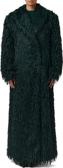 This luxurious shawl-collar coat is designed with an opulent soft-to-the-touch feather texture and removable power-shoulder pads to emphasize the shape.