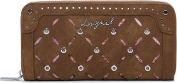 Glossy studs and grommets bring an edgy aesthetic to a slender faux-leather wallet organized with an array of pockets perfect for storing your cards and cash.