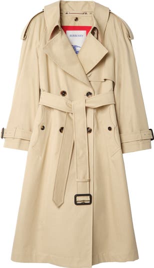 Adding volume to our signature rainwear, the Fitzrovia trench coat is made from water-resistant gabardine, treated for a soft finish. The A-line style is cut to a relaxed fit, featuring wider sleeves and a fuller skirt. Raglan construction gives a softer line at the shoulders while an archival trench inspires the curlicue shape of the pockets. Created as part of our Year of the Horse capsule, inside is a detachable wool blend warmer jacquard-woven with vibrant crayon red stripes and the Equestrian Knight Design.||Double-breasted button closure|Hook-and-eye collar closure|Throat latch|Epaulettes|B buckle belt|Side button welt pockets|Belted cuffs|Back button vent|Burberry Check undercollar|Detachable striped warmer|Comes with a garment bag