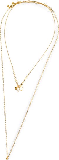 Delicate chains layer gracefully on this contemporary necklace accented with faux-pearl charms.