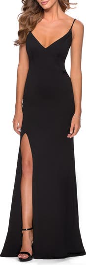 La Femme Long Jersey Dress with Cut Out Open Back, Main, color, Black