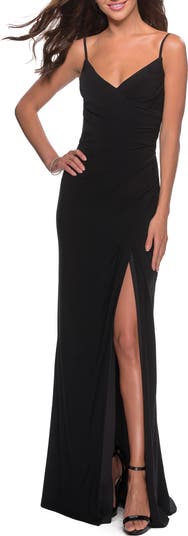 Long and sleek jersey homecoming dress with flattering side swept ruching and a simple V-neckline. A left leg slit and open back complete this look. Back zipper closure.