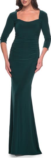 La Femme Long Jersey Evening Dress with Square Neckline and Sleeves, Main, color, Hunter Green