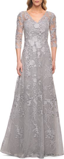 Lace long evening dress with V neckline and illusion three-quarter sleeves. Back zipper closure.