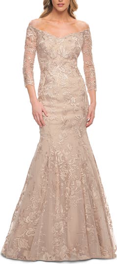 La Femme Long Lace Mermaid Gown with Off the Shoulder Top, Main, color, Champagne