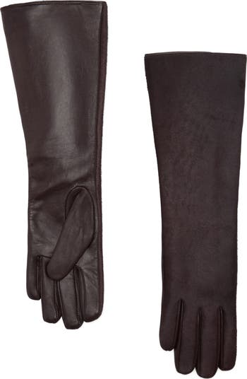 Add a sophisticated touch to your cold-weather look in this long leather gloves with a constrasting faux-fur back.