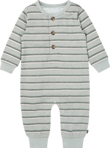 This baby boy romper is thoughtfully designed for cool-weather comfort and everyday charm. Made from soft, stretchy waffle knit fabric, it keeps baby warm and cozy while allowing easy movement. Long sleeves and full-length legs provide added coverage, while cinched ankles ensure a secure fit that stays in place. Leg snaps make dressing and diaper changes simple, and faux wood buttons add a stylish, rustic detail. Finished in a soft green-gray with a playful apple print, this romper is perfect for snuggly mornings and storybook afternoons. Our essentials have been independently certified with STANDARD 100 by OEKO-TEX® so that you don’t have to worry about harmful substances in your little one's wardrobe. Pack includes one long leg slouch romper from modern moments™ by Gerber®®.