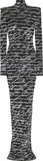 "Love Letter" jacquard knit dress Long, slim fit High neck Structured shoulders Long sleeves Visible gold metal double zip fastening on the back with Balmain Paris-engraved sliders "Love Letter" motifs in contrasting velvet yarn Jersey lining Model measures 179cm and wears a size 36 Main material: 70% polyamide 30% polyester Made in Bulgaria Item: EF1RR911JK07