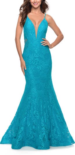 Slay prom in this one of a kind mermaid lace dress. A plunging V-shape neckline, low scoop open back, and dazzling sheer lace rhinestone back design make this look a perfect 10. Back zipper closure.