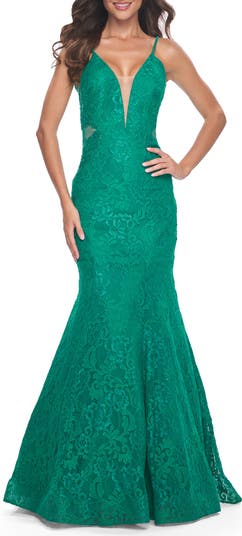 Slay prom in this one of a kind mermaid lace dress. A plunging V-shape neckline, low scoop open back, and dazzling sheer lace rhinestone back design make this look a perfect 10. Back zipper closure.