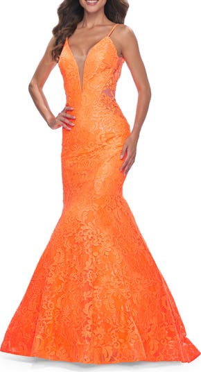 Slay prom in this one of a kind mermaid lace dress. A plunging V-shape neckline, low scoop open back, and dazzling sheer lace rhinestone back design make this look a perfect 10. Back zipper closure.