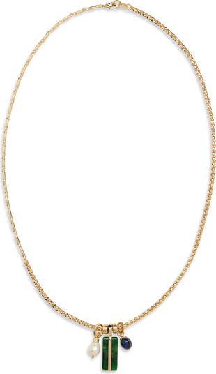 Tripled-up pendants made of freshwater pearl, moss agate and lapis in mixed shapes and sizes create a striking focal point on this polished box-chain necklace.