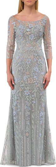 Gorgeous mother of the bride dress with a colorful lace design and boat neckline. The dress features illusion three quarter sleeves. Back zipper closure.