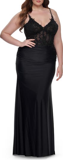 Long plus size prom dress with an illusion lace bodice and ruched stretch jersey skirt. Back zipper closure.
