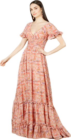 Obsessed with this A-line print gown in a floral pattern with cap sleeves. The flutter details at the waist with ruching for additional support and a unique style.