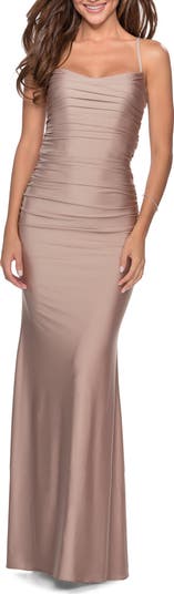 Long body hugging jersey prom dress with flattering ruching and square neckline. This look is complete with a criss-cross strappy back and is the perfect design for any formal occasion. Back zipper closure.