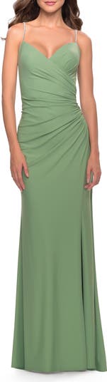 Flattering long jersey dress with ruching across the bodice and along the back zipper. V neckline and high slit. Back zipper closure.