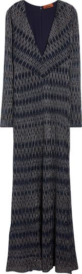 The classic Missoni zigzag is revised into a diamond pattern and rendered in a midnight-blue hue highlighted by sparkling metallic fibers for a stunning—yet so simple—plunge-neck maxi dress.