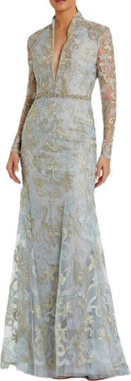This long-sleeve V-neck gown features metallic-gold applique and embroidered details, with a hand-beaded belt accentuating the natural waist for a refined look.