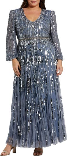 Dazzle in our plus-size Long Sleeve Beaded Crystal V Neck Gown, featuring intricate beadwork and sparkling crystals with a flattering V-neckline, ideal for formal events.