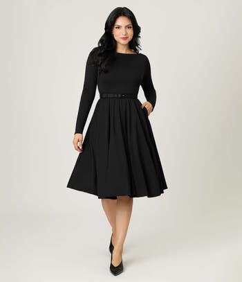 Step back into timeless elegance with the Devon Swing Dress! Crafted from sturdy stretch fabric, it features quarter sleeves, a darted bodice and a dramatic bateau neckline that transitions to a sultry V in the back. Complete with side pockets, a back zipper, and a matching belt.