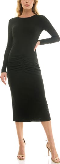 Designed to hug every curve, this long-sleeve body-con dress is defined by shirring through the hips that creates texture and a sculpted fit. The streamlined silhouette feels sleek and confident, with just enough stretch to move comfortably from day to night.