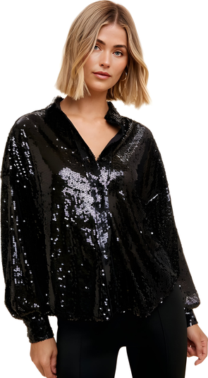 Add sparkle to your style with this dazzling sequin blouse from Knit & Lounge. Designed to make a statement, this button-down top features a classic shirt collar and voluminous long sleeves with gathered cuffs. Perfect for nights out or festive occasions, the glimmering sequins catch the light from every angle. The relaxed fit ensures comfort while keeping the silhouette effortlessly chic. Pair it with tailored pants or denim for a bold contrast and polished finish.