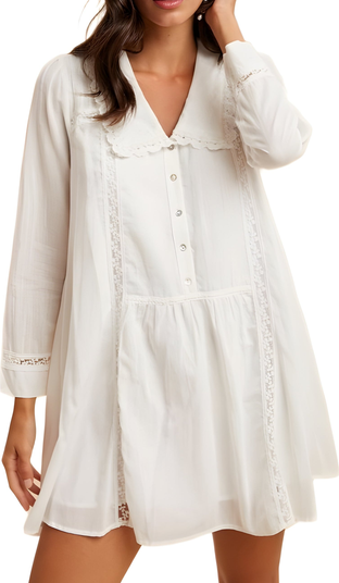 A sweet and charming mini dress designed for easy femininity and everyday wear. Featuring a crisp button-front bodice, dainty lace trim, and a statement collar, this relaxed babydoll silhouette offers soft movement and subtle structure.