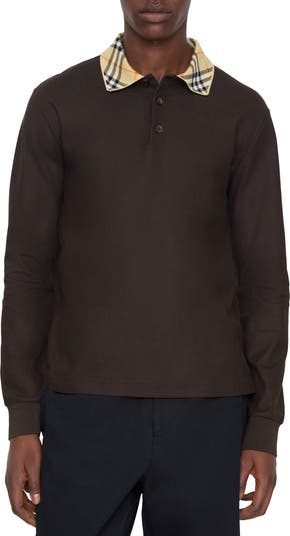 A long-sleeved polo shirt in lightweight cotton piqué, topped with a knitted Burberry Check collar in our signature sand beige colourway. The design is cut to a slim fit.||Button placket|Rib-knit cuffs