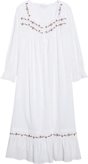 Delicately embroidered rosebuds and ruffled edges dial up the dreamy romance of this long-sleeved nightgown cut from fresh, breathable cotton.