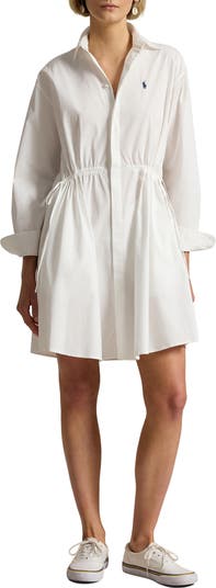 Crisp cotton poplin and a softly tailored silhouette emphasize the preppy polish of this abbreviated shirtdress cinched with a drawstring waist.