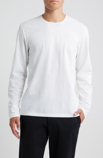 Opt for wardrobe simplicity in a stretch-added cotton T-shirt made with long sleeves and wearable all year round.