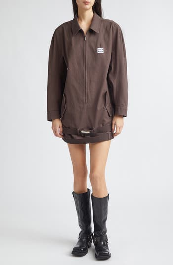 Known for combining shrewd Italian tailoring with stylish workwear in a nod to his blue-collar roots, Magliano imbues this dress with utility style through the long partial-zip closure and webbing belt that wraps twice around the hem. A humorous woven logo label marks the chest for subtle branding.