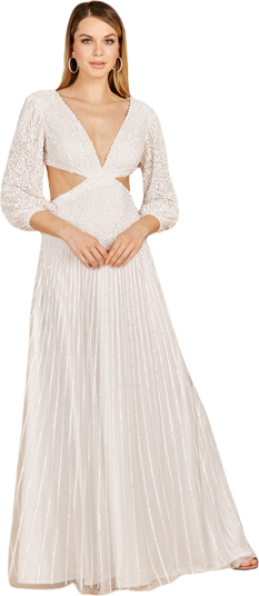 Beaded v-neckline a-line gown with a flowing skirt. The gown features long beaded sleeve detail with low back with lace up back details